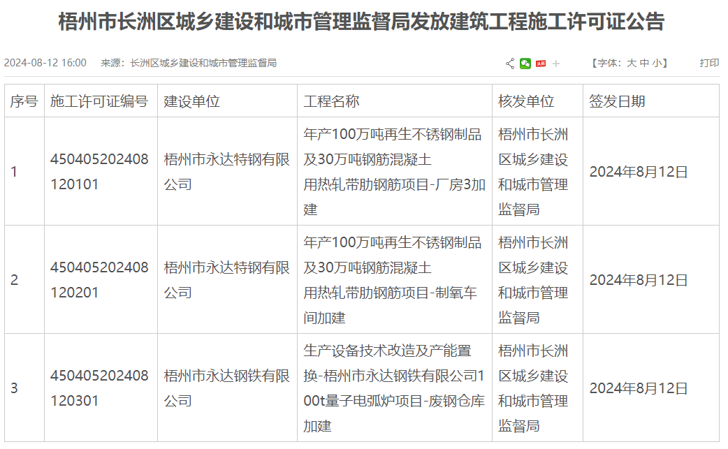 8月12日,梧州市永達(dá)特鋼有限公司年產(chǎn)100萬噸再生不銹鋼制品及30萬噸鋼筋混凝土用熱軋帶肋鋼筋項(xiàng)目廠房3加建、制氧車間加建以及100t量子電弧爐項(xiàng)目廢鋼倉庫加建均獲建筑工程施工許可證。