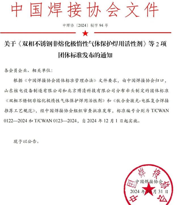 2024年10月31日,據(jù)中國焊接協(xié)會(huì)關(guān)于雙相不銹鋼非熔化極惰性氣體保護(hù)焊用活性劑》等2項(xiàng)團(tuán)體標(biāo)準(zhǔn)發(fā)布通知稱,由中國焊接協(xié)會(huì)歸口山東核電設(shè)備制造有限公司牽頭制定的團(tuán)體標(biāo)準(zhǔn)《雙相不銹鋼非熔化極惰性氣體保護(hù)焊用活性劑》標(biāo)準(zhǔn)編號(hào)為T/CWAN0122-2024,該標(biāo)準(zhǔn)將于2024年12月1日起實(shí)施。