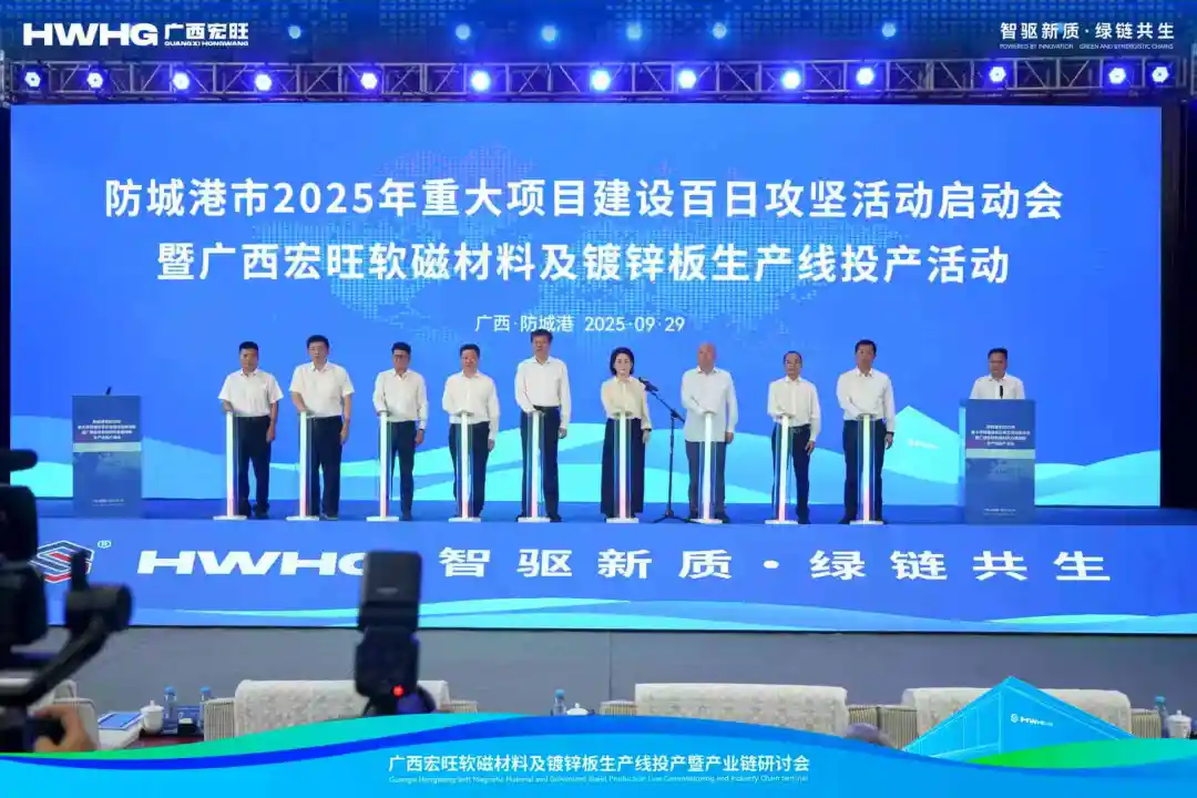 9月29日,廣西宏旺軟磁材料及鍍鋅板生產(chǎn)線投產(chǎn)活動隆重舉行。自治區(qū)黨委常委、自治區(qū)常務(wù)副主席許永錁出席活動,防城港市委書記黃江,市長邱明宏,市政協(xié)主席梁宗勇,自治區(qū)地質(zhì)礦產(chǎn)勘查開發(fā)局局長、自治區(qū)實體經(jīng)濟服務(wù)員工作隊駐防城港市工作隊隊長黎四龍,湖南省婁底市政協(xié)主席梁立堅,自治區(qū)發(fā)改委、工信廳、園區(qū)辦、防城港市四家班子及相關(guān)單位負責同志,行業(yè)協(xié)會專家、各金融機構(gòu)、各戰(zhàn)略合作單位,以及項目合作股東廣西盛隆冶金有限公司總經(jīng)理柯雪利、經(jīng)營總裁林能鏡,宏旺控股集團董事長、總裁戴促輝,集團副總裁朱繼喬、高志策、劉慧丹等領(lǐng)導嘉賓共同參與本次活動。防城港市委常委、常務(wù)副市長陶德文主持儀式。