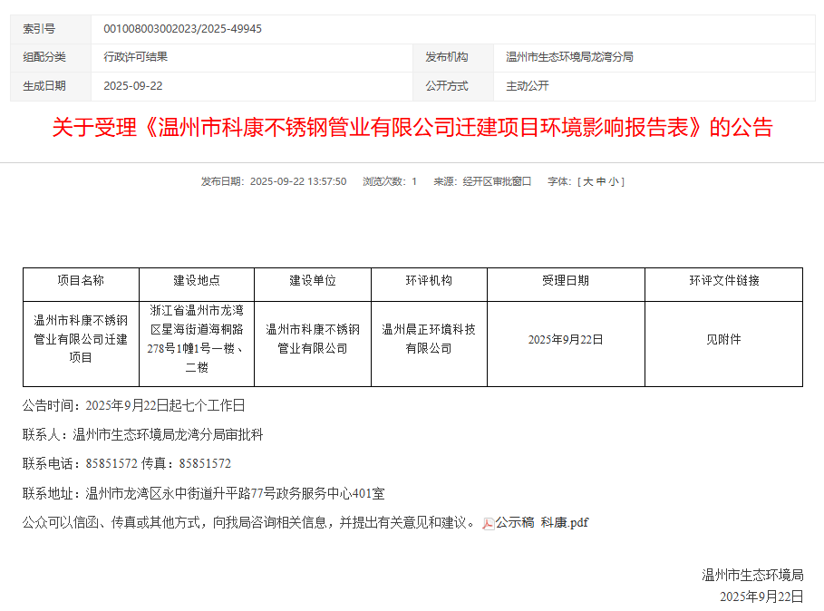 2025年9月22日,溫州市生態(tài)環(huán)境局受理溫州市科康不銹鋼管業(yè)有限公司遷建項目環(huán)境影響報告表并對外進(jìn)行公告,公告期:7個工作日。