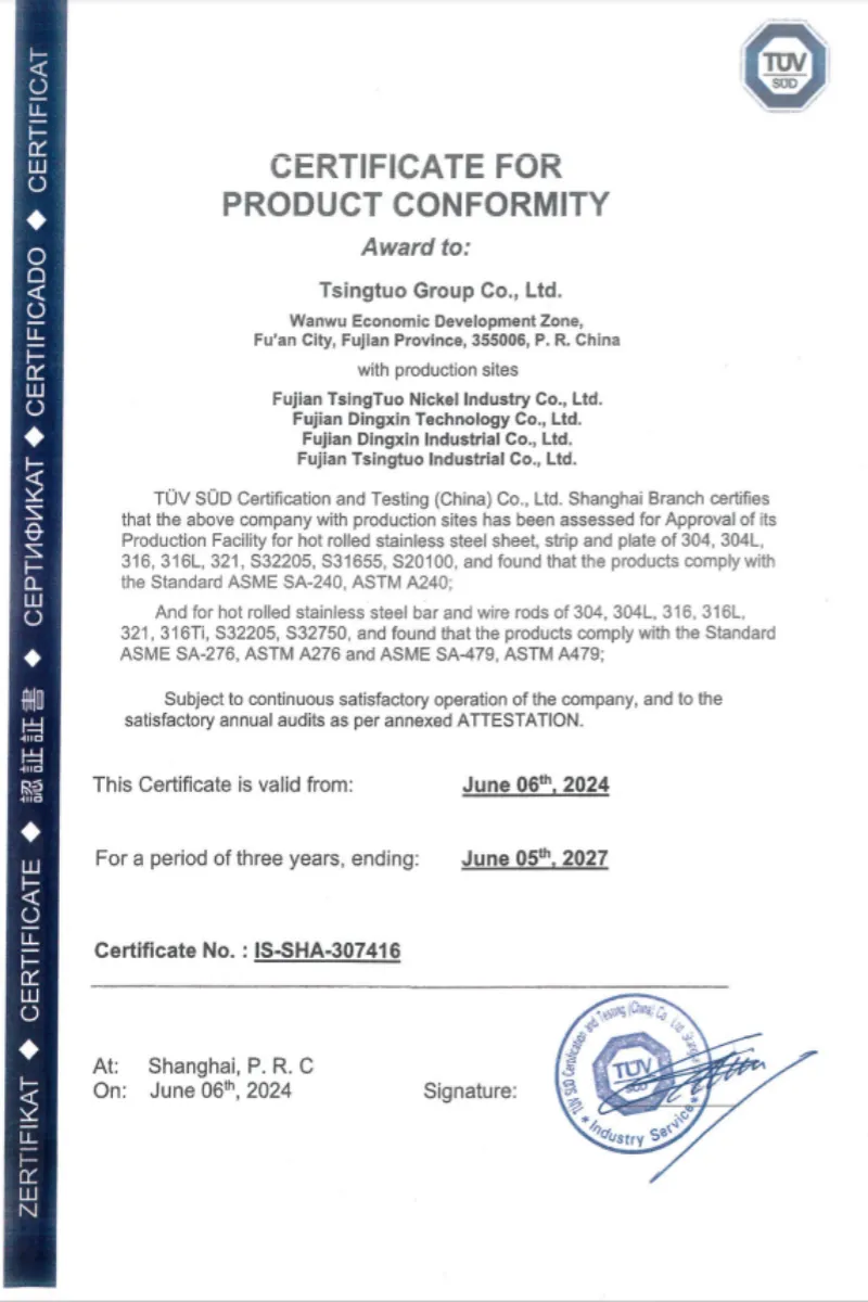 此次認(rèn)證范圍涵蓋福建青拓鎳業(yè)有限公司、福建鼎信科技有限公司、福建鼎信實(shí)業(yè)有限公司、福建青拓實(shí)業(yè)股份有限公司,產(chǎn)品包括熱軋不銹鋼卷帶、板材、棒材、盤條(牌號(hào)涉及304、304 L、316、316 L、321、316 Ti、S32205、S32750等),經(jīng)TüV南德取樣測(cè)試,認(rèn)證產(chǎn)品性能符合AS ME SA240/ASTM A240、AS ME SA276/ASTM A276和AS ME SA479/ASTM A479標(biāo)準(zhǔn)要求及產(chǎn)品性能要求。